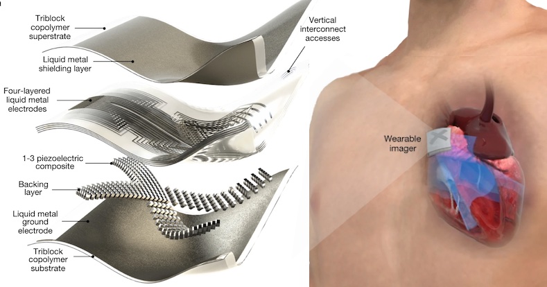 The adhesive sensor is as soft as skin and does not limit patients’ movement, and can be affixed to the chest with minimal restriction on exercise. It sends and receives ultrasound waves used to produce a constant stream of images of the heart structure in real time.