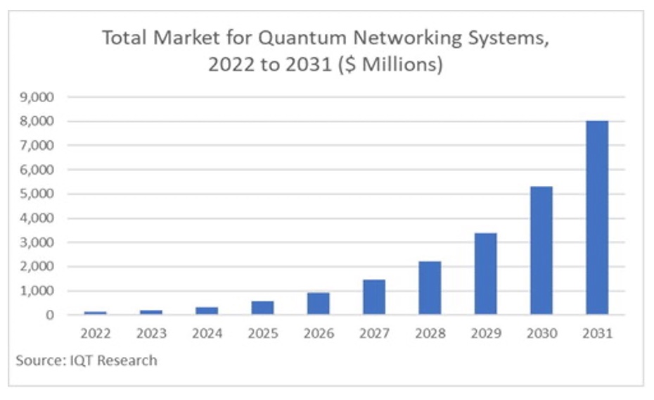 A recent report by IQT Research highlights that the worldwide quantum networking market will approach $1.5 billion by 2027 and pass $8 billion by 2031. Growth will be driven by the use of quantum key distribution (QKD) in many regions, followed by the rise of networks using quantum repeaters and quantum sensor networks. For now, quantum networks and QKD networks have equivalent weights.