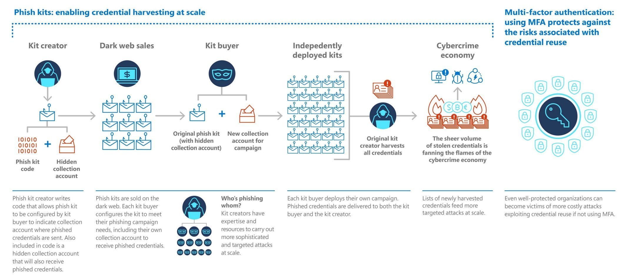 In 2020, there was a surge in phishing campaigns that remained stable throughout 2021. Microsoft identified an increase in the overall number of phishing emails, a downward trend in emails containing malware, and an increase in voice phishing (or vishing). Microsoft’s Digital Crimes Unit (DCU) investigated online organized crime networks involved with compromising corporate emails and found a wide diversification of how email credentials are obtained, verified, and used. The conclusion is that investments in automation and acquisition tools are growing in order to raise the profit from criminal activities.