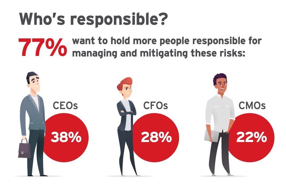 Ein großer Teil der Befragten (77 %) würde es begrüßen, wenn mehr Personen im Unternehmen für die Verwaltung und Minderung dieser Risiken verantwortlich wären. Dies könnte eine Kultur der „Sicherheit durch Design“ im gesamten Unternehmen fördern. Die größte Gruppe der befragten Personen (38 %) spricht sich dafür aus, die CEOs zur Verantwortung zu ziehen. Als weitere Verantwortungsträger außerhalb der IT wurden CFOs (28 %) und CMOs (22 %) benannt.