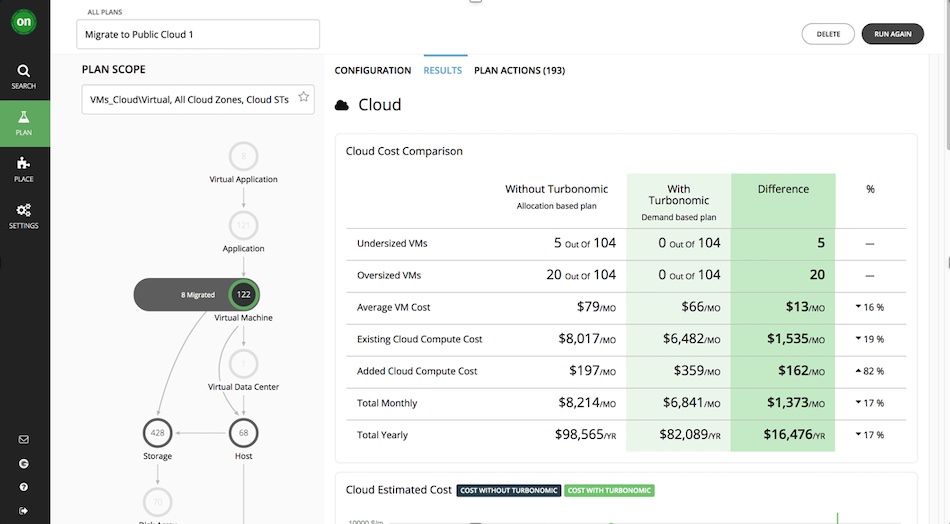 Eine besondere Funktion von Turbonomic ist die Kapazitätsplanung. Diese simuliert Umgebungsveränderungen durch neue Arbeitslasten, um festzustellen, ob die derzeit genutzten Ressourcen die geplante Nutzung aufrechterhalten können. Auf dieser Grundlage kann dann entschieden werden, ob die Kapazität begrenzt oder erhöht werden soll. So lässt sich der Zeitaufwand für die Bereitstellung virtueller Ressourcen und die Optimierung der Nutzung virtueller Maschinen verringern.