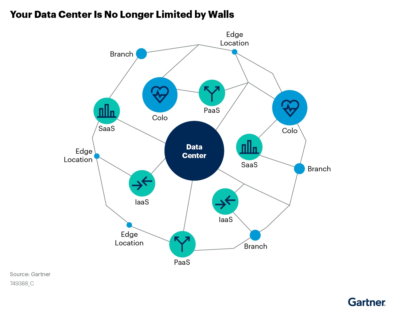 Mit anderen Worten: Die Funktionen des Rechenzentrums können nicht mehr an einem einzigen physischen Standort zentralisiert werden. Stattdessen werden komplexer Geschäftsanforderungen an verschiedene Cloud-, Rechenzentrums-, Colocation- und Edge-Standorten erfüllt.
