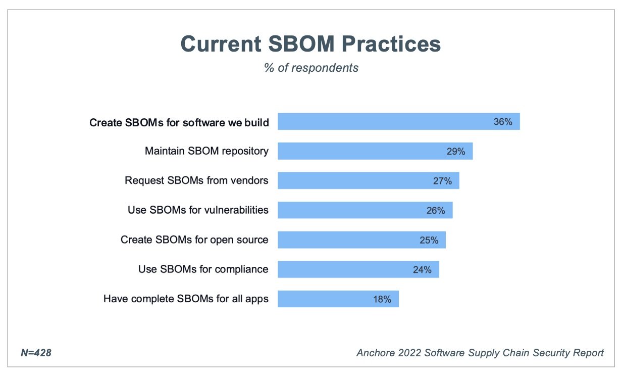 Für 54 % der Befragten wird die Sicherheit der Software-Lieferkette im Jahr 2022 ein wichtiges Thema sein – wenn sie nicht sogar das Hauptaugenmerk darauf legen. Und bereits jetzt setzen 76 % der großen Unternehmen verstärkt auf die sogenannte Software Bill of Materials (SBOM). Das lässt vermuten, dass SBOM-Abläufe, die das Ziel haben, die Sicherheit der Software-Lieferkette zu verbessern, an Bedeutung gewinnen. Bis jetzt verfügen allerdings nur 18 % der Befragten über vollständige SBOMs für alle Anwendungen. Weniger als ein Drittel der Befragten befolgt Best Practices für die Pflege eines SBOM-Repositorys und die Anforderung von SBOMs von Anbietern.