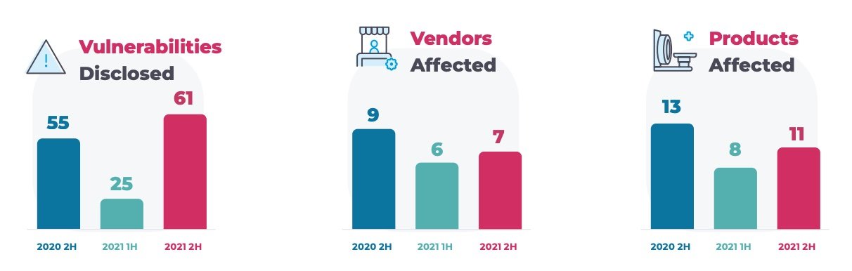 Laut der Studie ist die Zahl der gemeldeten Schwachstellen im Vergleich zum ersten Halbjahr 2021 um 21 % auf insgesamt 651 CVEs gestiegen. Die Zahl der betroffenen Lieferanten und Produkte ist jedoch im Vergleich zum zweiten Halbjahr 2020 zurückgegangen.