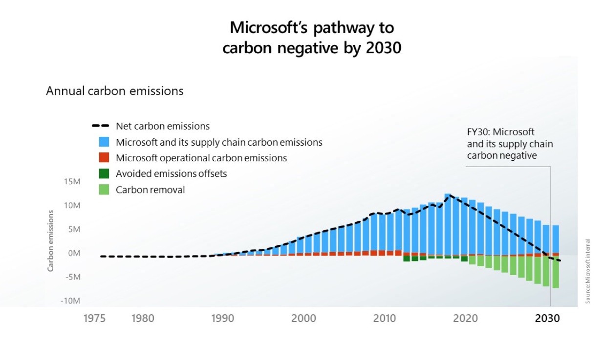 Bis 2050 will Microsoft außerdem den gesamten Kohlenstoff, den das Unternehmen seit seiner Gründung im Jahr 1975 direkt oder durch den Stromverbrauch ausgestoßen hat, aus der Umwelt entfernen.
