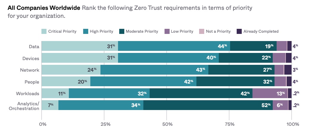 Es ist wenig überraschend, dass als Kategorien mit der höchsten Priorität weiterhin Daten, Netzwerke und Geräte genannt werden. Die Studie prognostiziert dennoch, dass sich dies im Lauf der Zeit ändern könnten. Besonders der Aspekt des Menschen könnte allmählich an Bedeutung gewinnen – denn es wird zunehmend mehr Gewicht auf die Nutzer und weniger auf die Geräte gelegt. „Identität ist ein mächtiger Multiplikator für Zero-Trust-Initiativen, auch wenn sie nicht deren einzige wichtige Komponente ist“, so die Studie. Sie erklärt auch, dass es für die Cybersicherheit besonders wichtig ist, für jede Person immer ausreichenden Zugang zu den richtigen Ressourcen sicherzustellen. Ebenso hervorzuheben sind die Einhaltung von Vorschriften und viele andere Belange, die mit dem Technologieuniversum zusammenhängen.
