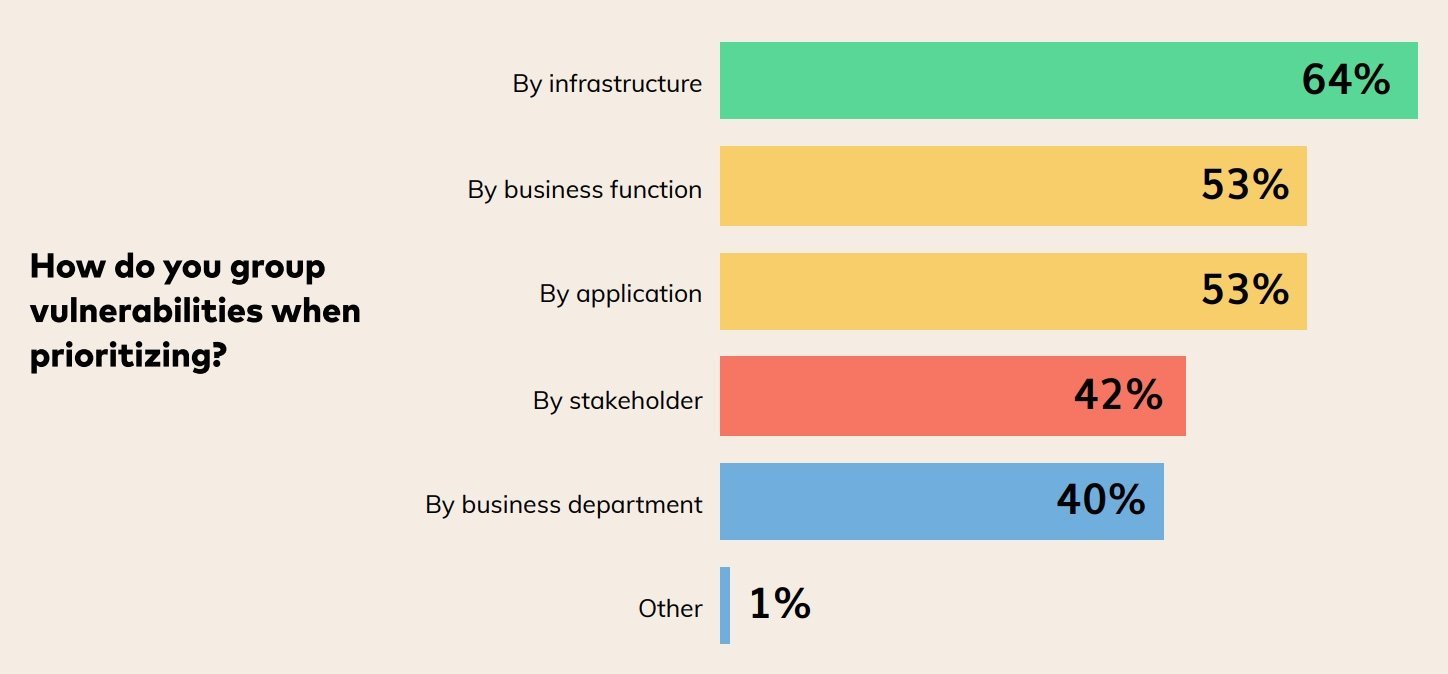Die Studie zeigte, dass die meisten Befragten die Schwachstellen nach Infrastruktur (64 %), nach Geschäftsfunktionen (53 %) und nach Anwendungen (53 %) gruppieren. Eine Risikopriorisierung, die nur mit Infrastruktur- und Anwendungsgruppen in Verbindung gebracht wird, ist allerdings nicht relevant, ohne den Anlagenkontext zu berücksichtigen, betont Vulcan Cyber.