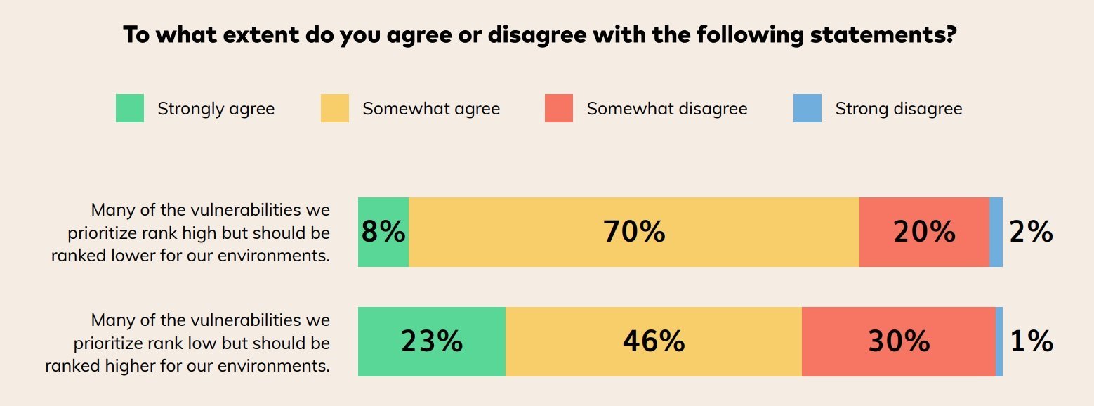 Die Umfrage zeigte außerdem, dass sich diese Methoden als unzureichend erweisen und dass die derzeit von den Unternehmen angewandten Verfahren zur Priorisierung von Schwachstellen generell nicht übereinstimmen. Für 78 % der Befragten sollten Schwachstellen mit hoher Priorität niedriger eingestuft werden, während 69 % der Befragten angaben, dass Schwachstellen auf niedrigeren Positionen höher eingestuft werden sollten. Über 80 % der Befragten sind der Meinung, dass sie von einer größeren Flexibilität bei der Priorisierung von Schwachstellen auf der Grundlage ihrer spezifischen Risikoumgebung profitieren würden.