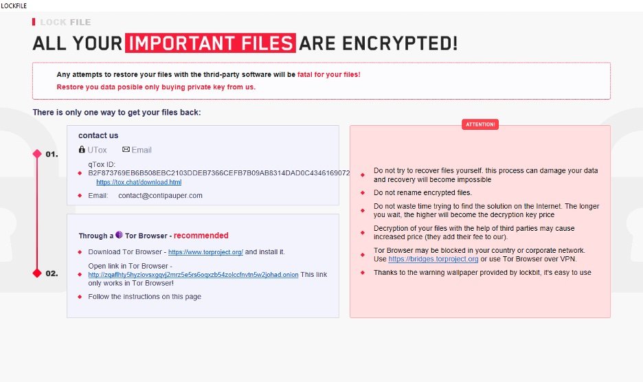 Der Name der verschlüsselten Dokumente verwendet Kleinbuchstaben und die Erweiterung .lockfile. Anstatt eine Lösegeldforderung im TXT-Format einzufügen, verwendet LockFile eine HTML-Anwendungsdatei (HTA), ähnlich der, die von der LockBit 2.0 Ransomware verwendet wird, so die Sophos Forscher. In der Warnung werden die Opfer aufgefordert, sich an die E-Mail-Adresse contact@contipauper.com zu wenden. Die Domain, die am 16. August 2021 erstellt wurde, könnte ein abfälliger Verweis auf eine konkurrierende Ransomware-Gruppe namens Conti sein.