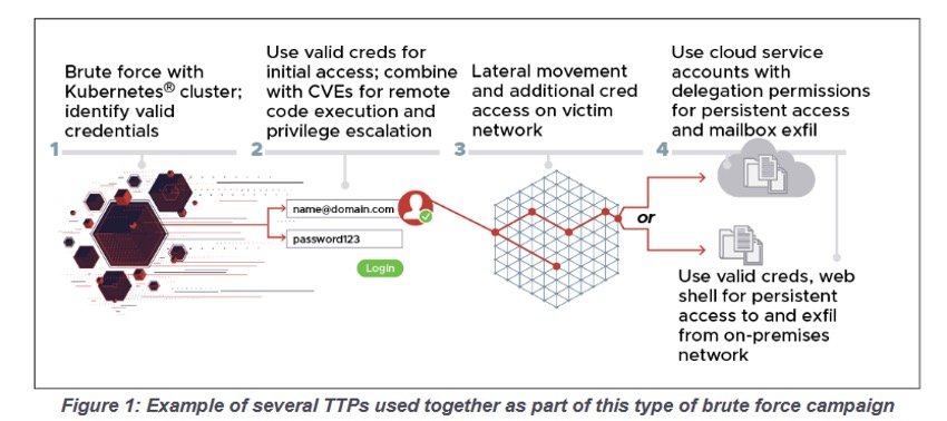 Brute-Force-Techniken dienen dazu, gültige Anmeldedaten aufzudecken, wobei häufig umfangreiche Login-Versuche unternommen werden. Zum Teil werden aber auch Benutzernamen und Passwörter, die zuvor durchgesickert sind oder durch Variationen gängiger Passwörter erraten wurden, verwendet. Die Brute-Force-Technik ist zwar nicht neu, doch diese Gruppe nutzt auf einzigartige Weise Kubernetes-Container, um die Brute-Force-Versuche auf einfache Weise zu verstärken.