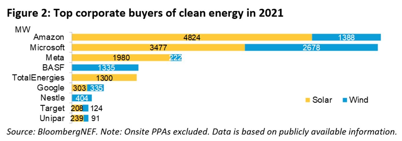 Insgesamt erwarben die Unternehmen im Jahr 2021 eine Rekordmenge von 31,1 GW an sauberer Energie über PPAs, was einem Anstieg von fast 24 % gegenüber dem Vorjahresrekord von 25,1 GW entspricht. Mehr als zwei Drittel (65 %) dieser Beschaffungen erfolgten in den Vereinigten Staaten. Dieses starke Wachstum ist vor allem auf die größten Technologiekonzerne zurückzuführen, die zusammen mehr als die Hälfte der Verträge unterzeichneten.