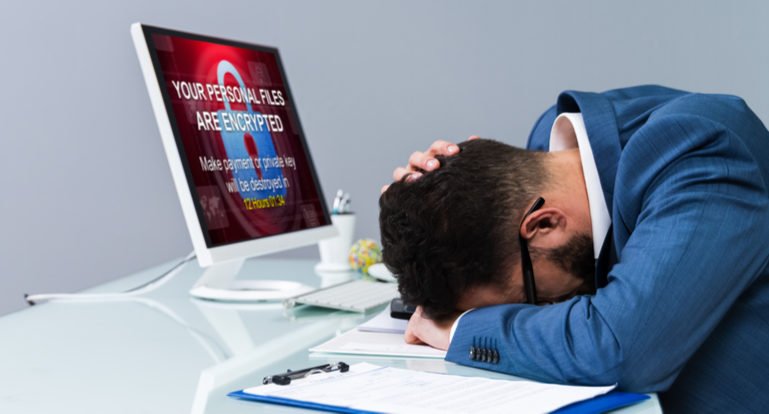 Home > Cybersecurity > Verzweifelte Person vor Ransomware-Meldung