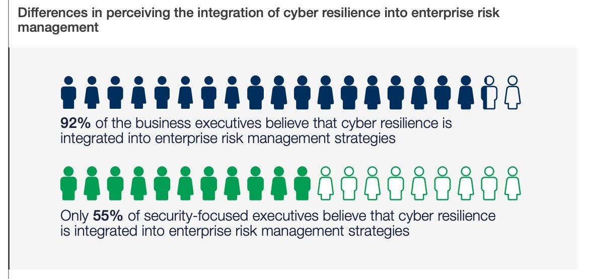 Auch andere Zahlen unterstreichen den Unterschied in der Sichtweise zwischen den beiden Bereichen. Etwa 92 % der Führungskräfte in der Wirtschaft sagen, dass die Widerstandsfähigkeit gegenüber Cyberangriffen Teil der Risikomanagementstrategien von Unternehmen ist – aber nur 55 % der Führungskräfte im Bereich der Cybersicherheit stimmen dem zu. Solche Divergenzen, die auf uneinheitliche Prioritäten und Richtlinien zurückzuführen sind, können Unternehmen anfälliger für Angriffe machen.