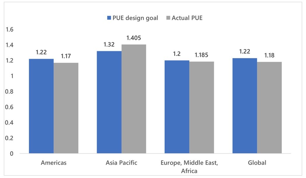 Microsoft hat sich verpflichtet, das Design und die Wartung seiner Rechenzentren kontinuierlich zu verbessern, um dem angestrebten Wert von 1 so nahe wie möglich zu kommen. In der nachstehenden Grafik zeigen die blauen Balken die geschätzten oder prognostizierten PUE-Werte, während die grauen die tatsächlichen PUE-Messungen der Microsoft-Einrichtungen darstellen. Im Beispiel weist Microsoft darauf hin, dass der tatsächliche PUE-Wert im asiatisch-pazifischen Raum am höchsten ist – zurückführen ließe sich das zum Teil auf die höheren Umgebungstemperaturen, die eine stärkere Kühlung der Rechenzentren erfordern.