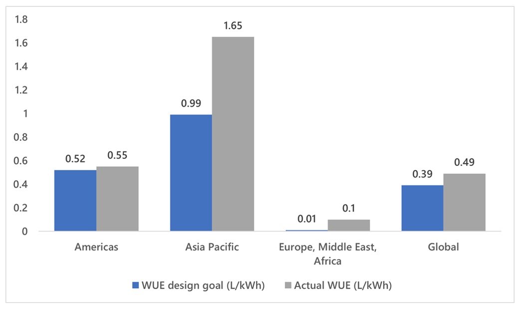 In ähnlicher Weise misst Microsoft die Water Usage Effectiveness (WUE) im Betrieb seiner Rechenzentren. Wie bei der PUE gibt es auch hier Variablen, die sich auf diese Zahl auswirken können – viele davon hängen mit dem Standort der Einrichtung zusammen. Rechenzentren in kälteren Regionen der Welt, wie beispielsweise in Schweden und Finnland, benötigen weniger Wasser zur Kühlung. Das folgende Diagramm zeigt (wie oben) die geschätzten oder prognostizierten WUE-Werte in Blau und in Grau die tatsächlichen Zahlen. Auch hier weist der asiatisch-pazifische Raum die höchsten WUE-Messwerte auf: Grund hierfür sei erneut das wärmere Klima und die damit verbundene Notwendigkeit der Wasserkühlung an einigen Orten.