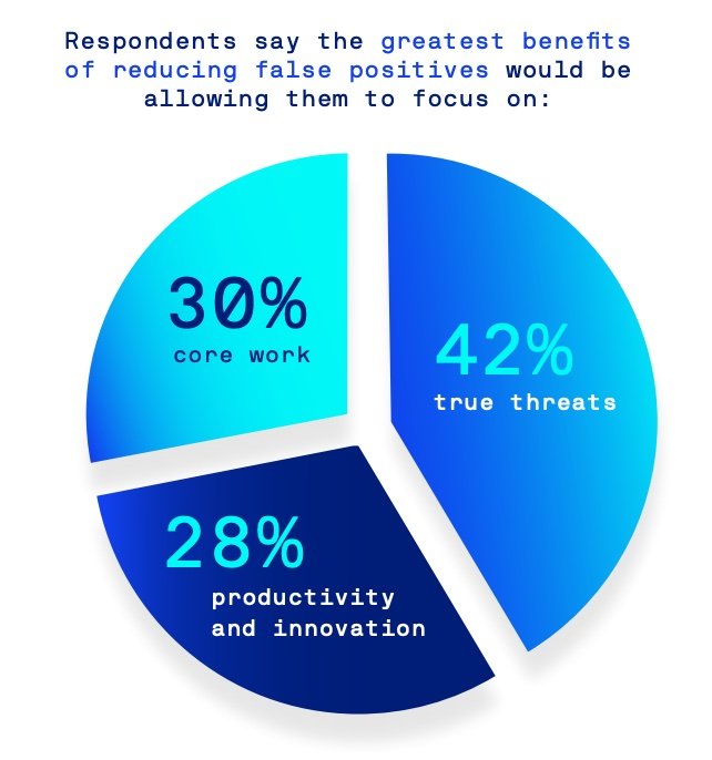 Ein weiteres, weit verbreitetes Problem besteht in der Überfrachtung der Sicherheitsexperten mit Warnungen, die in der Regel ins Leere laufen. Ein großer Teil der befragten Personen (80 %) betonte, dass mindestens eine von fünf kritischen Meldungen fälschlicherweise positiv sei. Dagegen gaben 33 % an, dass sogar mindestens die Hälfte der Warnungen falsch positiv ausfallen. Laut beiden Gruppen bestünde der größte Vorteil der Beseitigung von Fehlalarmen darin, dass sie mehr Zeit für echte Bedrohungen (42 %) und andere wichtige Aufgaben (30 %) aufwenden könnten. Die Produktivität und Innovationszyklen könnten sich dadurch erhöhen (29 %). Zur Verminderung dieses Problems würde maschinelles Lernen beitragen.