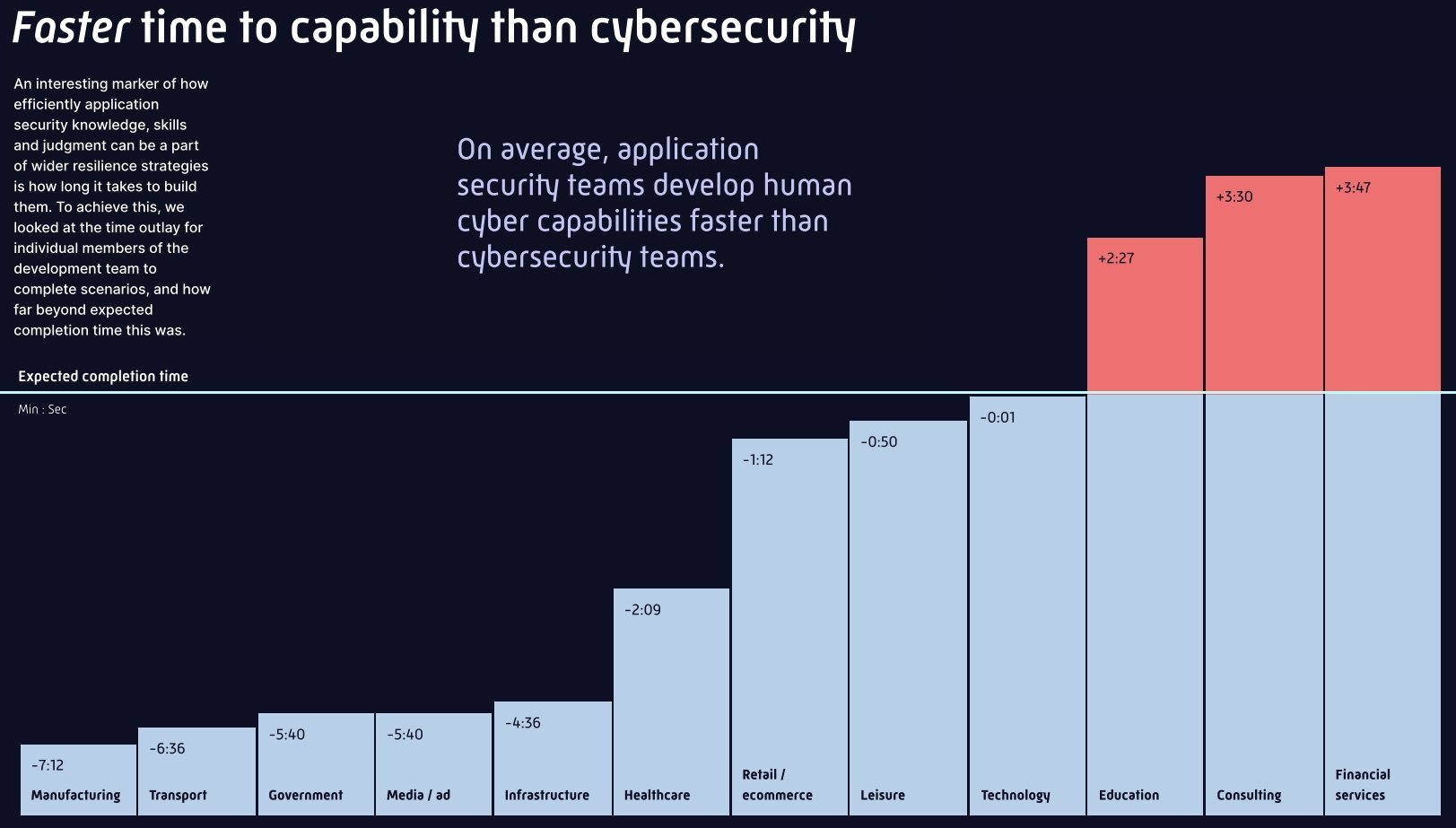 Teams, die sich mit Anwendungssicherheit befassen, entwickeln zudem schneller Personalressourcen im Cyberbereich als Cybersicherheitsteams. Bei der Analyse von 43.000 Anwendungssicherheitsübungen wurde festgestellt, dass 78 % schneller als erwartet abgeschlossen wurden, verglichen mit nur 11 % in Cybersicherheitslabors. Im Durchschnitt wurde die Anwendungssicherheitsübung 2,5 Minuten kürzer als erwartet abgeschlossen – während sie in Cybersicherheitslabors 17 Minuten länger als angenommen dauerte.