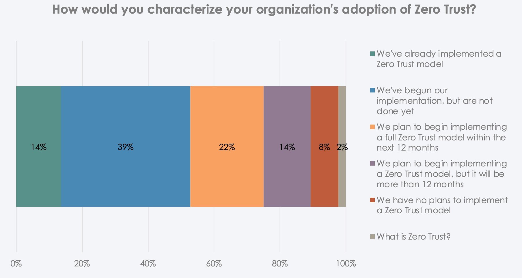 Demnach gaben nur 14 % der befragten Fachleute an, eine Zero-Trust-Lösung vollständig implementiert zu haben. Weitere 39 % haben damit begonnen, sich mit dem Thema zu befassen, und 22 % gaben an, dass sie planen, Zero Trust im Laufe dieses Jahres einzuführen. Nur einer von fünf Sicherheitsverantwortlichen ist jedoch davon überzeugt, dass seine Organisation Zero Trust versteht.