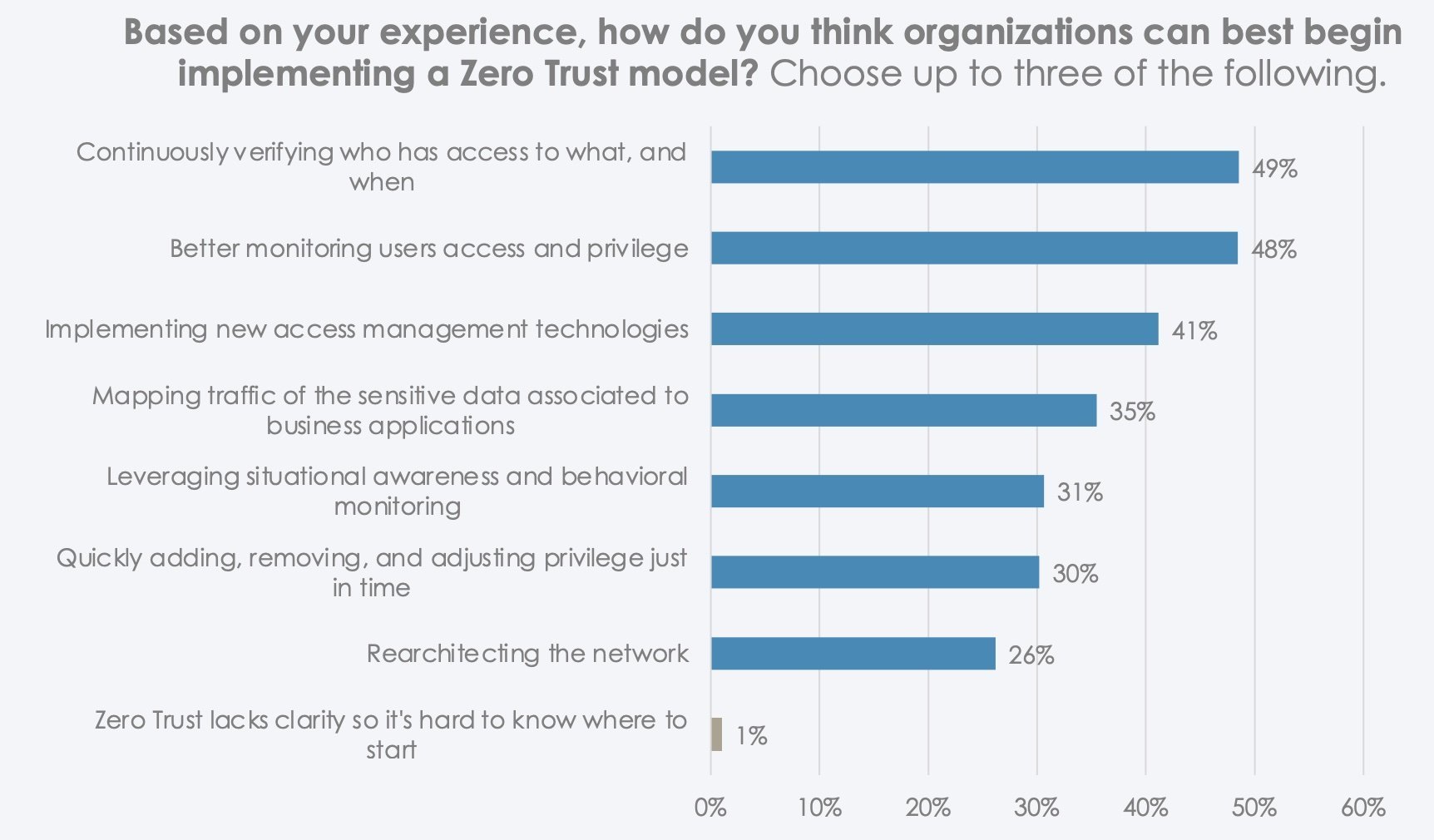Eines der Haupthindernisse für den Erfolg von Zero Trust ist die mangelnde Klarheit darüber, wie die Einführung vonstattengehen soll. Etwa 61 % der Sicherheitsexperten konzentrieren sich bei der Umsetzung auf die Neukonfiguration von Zugriffsrichtlinien. 54 % sind dagegen der Meinung, dass es zunächst darum geht, zu ermitteln, wie sensible Daten über das Netzwerk verteilt werden. Währenddessen setzen bereits 51 % neue Technologien ein, um Zero Trust zu erreichen.