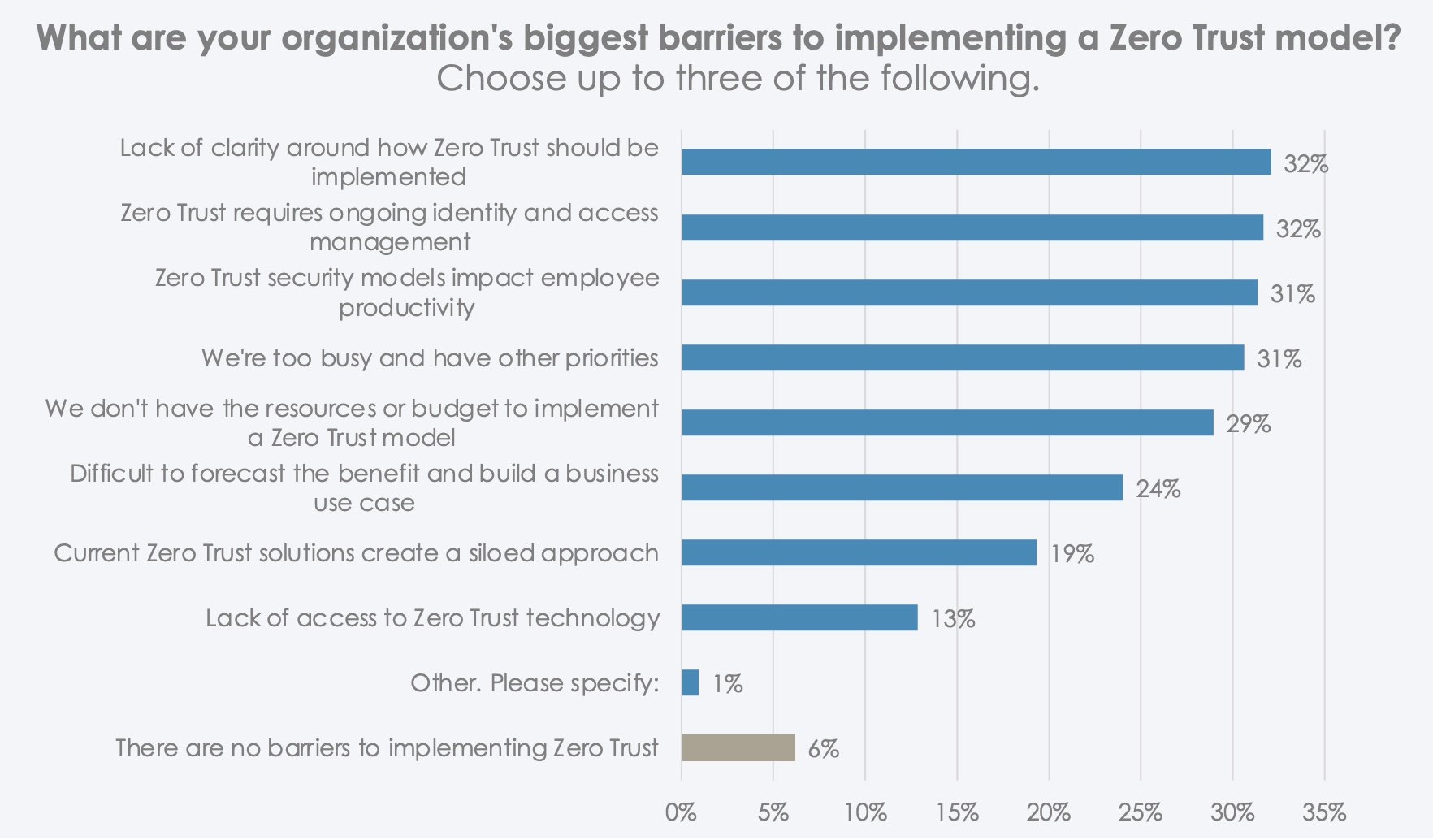 Allerdings haben insgesamt 32 % der Sicherheitsteams kein umfassendes Verständnis davon, wie Zero Trust in ihrem Unternehmen implementiert werden soll. Ein weiteres wichtiges Hindernis bei der Einführung von Zero Trust sind konkurrierende Prioritäten (31 % sind zu sehr mit anderen täglichen Prioritäten beschäftigt). Auch die Ansicht, dass Zero Trust der Produktivität des Unternehmens schaden könnte, wirkt hinderlich. (Z. B. glauben 31 % fälschlicherweise, dass Zero-Trust-Sicherheitsmodelle die Produktivität der Mitarbeiter beeinträchtigen.)