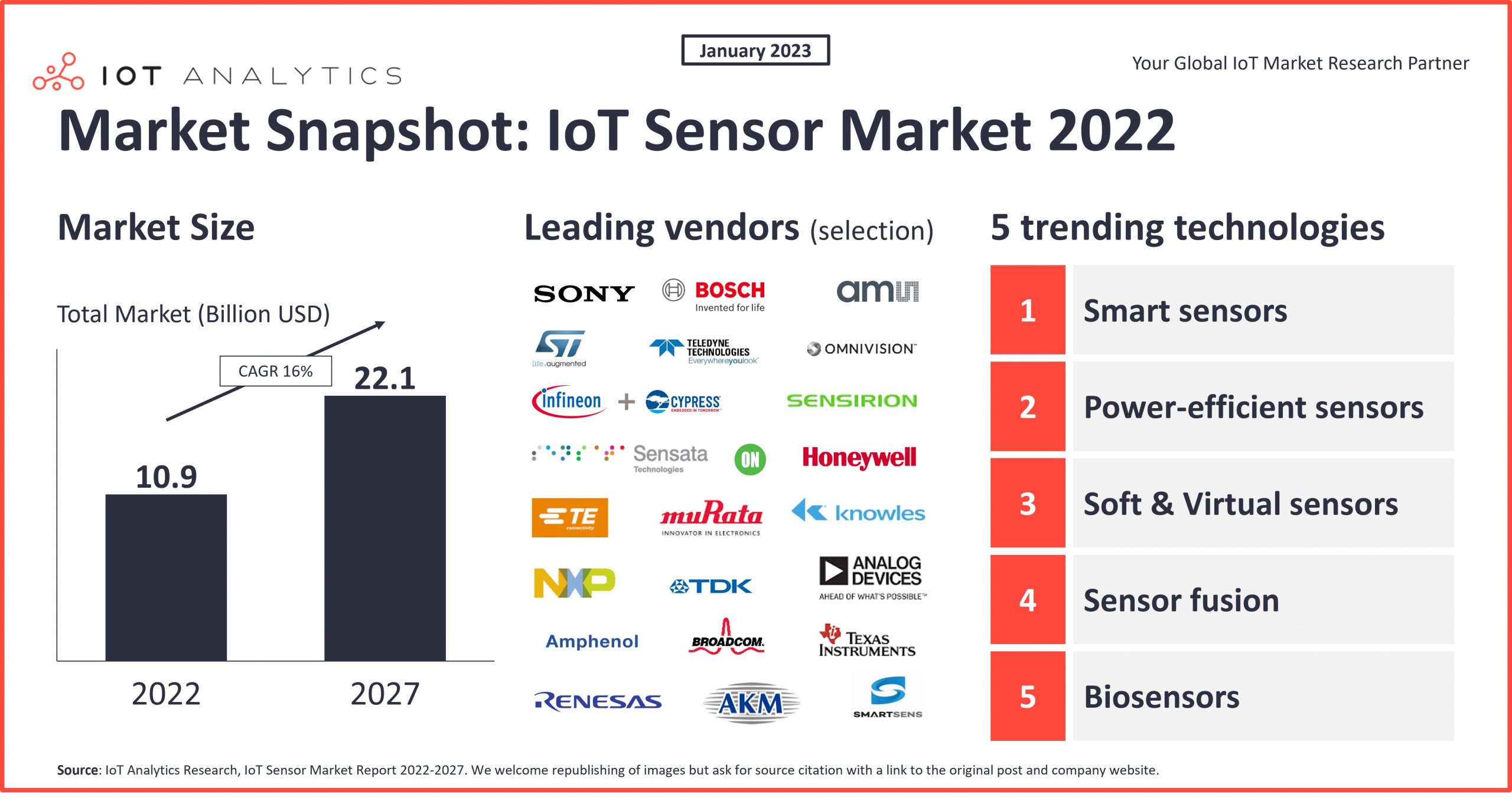 Today, four new sensors, on average, are connected to every new IoT device brought online, according to IoT Analytics. A third of all sensors shipped to the market in 2022 was part of a connected IoT device.