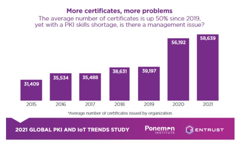 Worryingly, however, respondents to the Ponemon Institute survey said that IoT is also the area expected to experience the most change and uncertainty. The study highlights some major challenges in the PKI and digital certificate universe. The big hurdle is lack of clarity around who is responsible for PKI within organizations – it was named as the top challenge for the fifth consecutive year, with a significant increase in the share of respondents citing it – from 63% in 2020 to 71% in 2021. Scarcity of resources (51%) and skills (46%) – which has never been greater – rounded out the top three challenges mentioned. More than half of respondents (55%) also said that their organization’s existing PKI is unable to handle new applications.