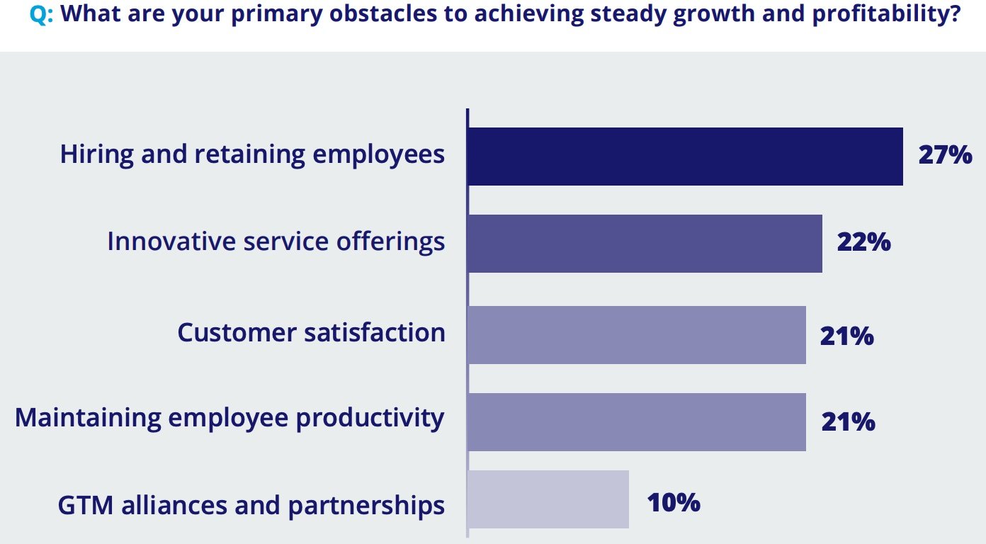 While digital transformation presents opportunities for MSPs, the survey also showed that the landscape is not free of barriers to address. Employee retention and engagement is the number one barrier cited in the survey to maintaining growth rates and profitability (27% of respondents). Delivering innovative services to meet customers’ digital transformation demands was the second-highest barrier mentioned (22%), and closely followed by another 21% citing customer satisfaction and employee productivity as other obstacles.
