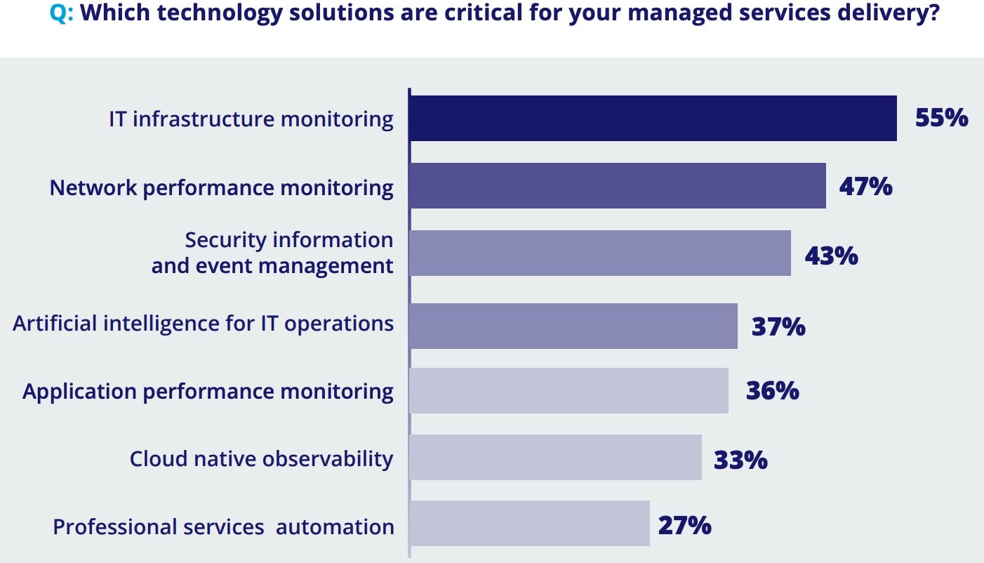 And because providing managed services is no easy task, MSPs need to have the right tools to manage their own work. This is where monitoring solutions for IT infrastructure, network performance and security information and events come in. These are exactly the top three priorities for MSPs, earning the attention of more than 40% of respondents. More than a third of respondents chose newer solutions such as AIOps and cloud-native observability.