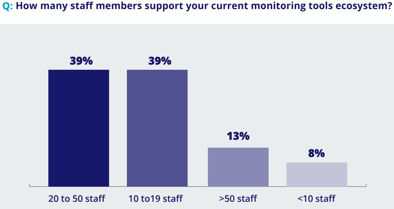 While all is not lost in terms of tool consolidation, half of all respondents said they have 10 or more systems in their monitoring ecosystem. Only 5% have fewer than five. It should not be forgotten that the more monitoring tools are being used, the more human resources are needed to manage them and the more difficult it is to consolidate monitoring data into a coherent, centralised view of the state of infrastructures.