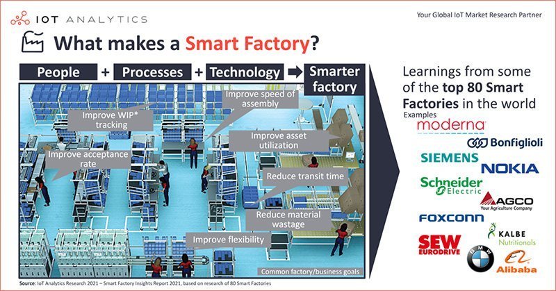 Não, ainda não existe um teste que meça o Quociente de inteligência (QI) de centros de manufatura, mas um relatório recentemente publicado pela IoT Analytics faz uma análise aprofundada de três elementos principais de qualquer projeto envolvendo fábricas inteligentes deveria considerar: processos, pessoas e tecnologia. Abordando detalhadamente 10 estudos de caso, o estudo “Smart Factories Insights Report 2021” apresenta as tecnologias implantadas e os objetivos alcançados, além de apresentar uma visão geral dos modelos de maturidade das fábricas inteligentes.