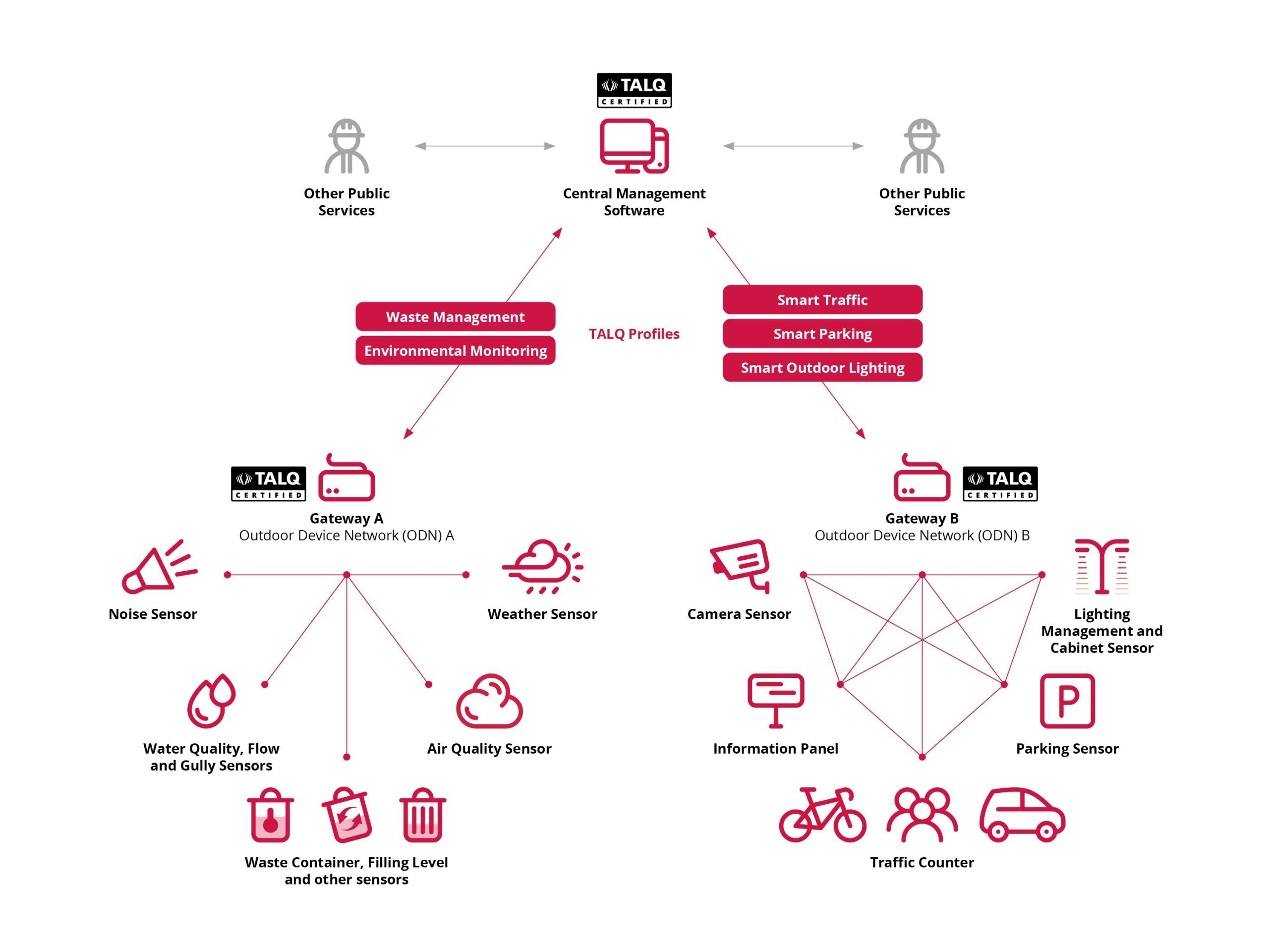 O Smart City Protocol é uma especificação para troca de informações, adequada para integração em diversos produtos e sistemas de software. Dessa forma, a interoperabilidade entre o software de gerenciamento central (CMS) e as redes de dispositivos externos (ODN) de diferentes fornecedores é habilitada. Graças ao TALQ, um único CMS pode configurar, controlar, comandar e monitorar redes heterogêneas de dispositivos de cidades inteligentes.