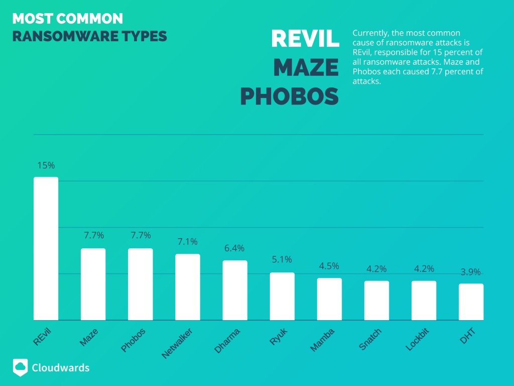 Regardless of the medium, whether through the inattention of a single user, or the carelessness of the team managing the network, the malicious software reaches your systems and, between 45 minutes and 4 hours, wreaks havoc that could cost millions. The last major cyberattack of this type, executed by the REvil network (Sodinokibi), compromised hundreds of American companies by exploiting a security breach. Such a criminal variant was responsible for 15% of ransomware in 2020, followed by Maze and Phobos (accounting for 7.7% each). And the attacks won’t stop there. They have been evolving since the first on record in 1980, and over 70% of them are successful.