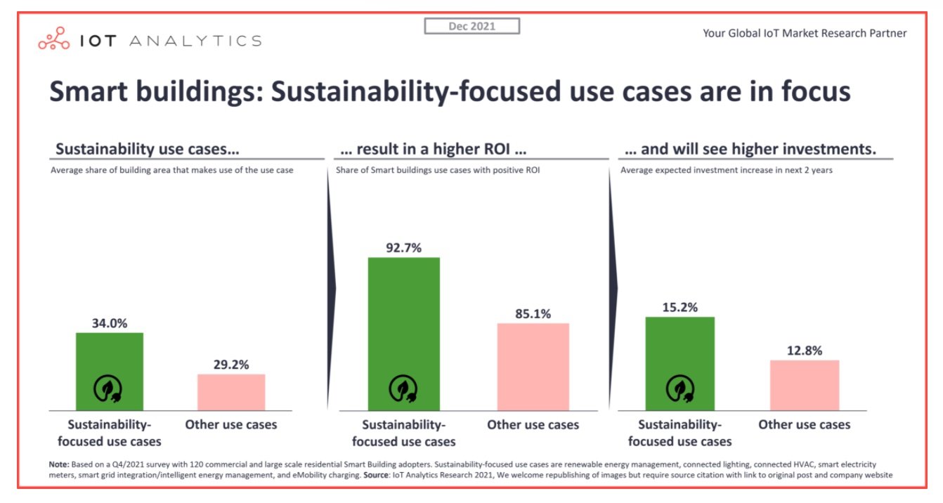 The study highlights that smart building use cases with a direct effect on sustainability result in a higher ROI (Return on Investment) than other use case categories (93% of them show a positive ROI). These use cases are also expected to be adopted more quickly over the next few years – 15% increase over the next two years versus an average increase of 13%.
