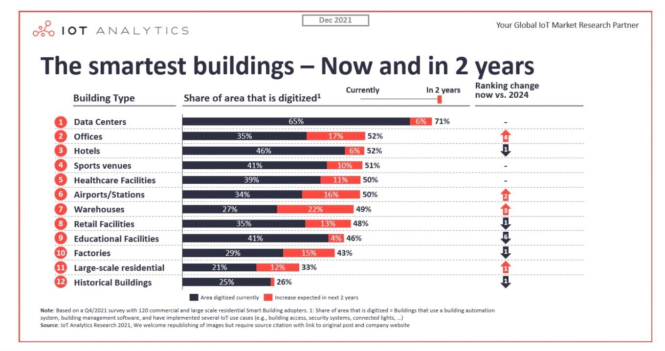 Currently, data centres are the smartest building type, with advanced scanning in 65% of the gross floor area. Hotels (46%) and educational facilities (41%) round out the top three smartest buildings. However, in the next two years, this ranking is expected to change. According to IoT Analytics, offices will be the second-smartest building type globally (with 52% of gross floor area with advanced digitization) and hotels will rank third (51.5%); data centers will remain at the top (71%). Warehouses are expected to have the highest digitization rate (from 27% to 49%). And today’s least intelligent building types should catch up (except historic buildings).